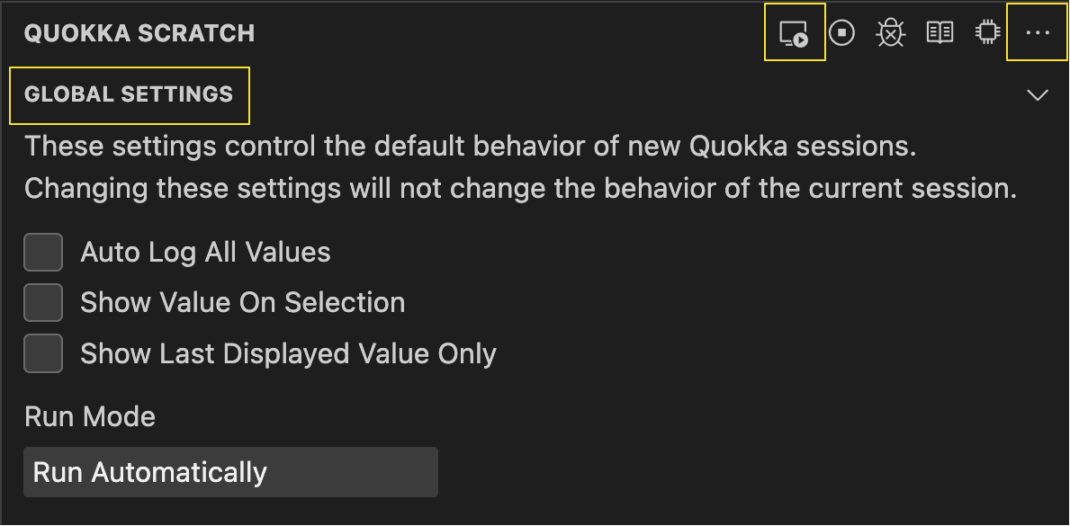 A new Run Mode global setting can be used to control Quokka’s execution behavior on startup. The runMode setting can be set to auto (default), onsave, or ondemand to control how Quokka executes code when it starts up. This new setting allows you to always start Quokka in your preferred mode without needing to manually change it each time you start a new session.